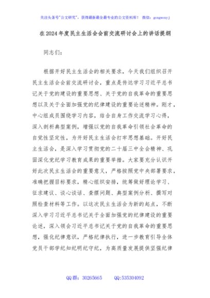 / 在2024年度民主生活会会前交流研讨会上的讲话提纲