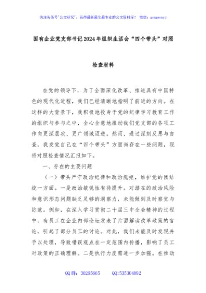 / 国有企业党支部书记2024年组织生活会“四个带头”对照检查材料