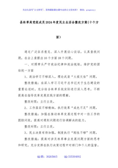 / 县林草局党组成员2024年度民主生活会整改方案(十个方面)