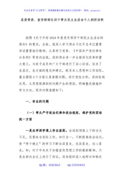 / 县委常委、宣传部部长四个带头民主生活会个人剖析材料