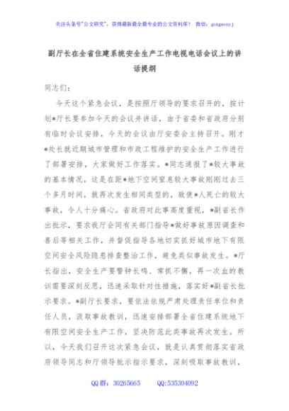 / 副厅长在全省住建系统安全生产工作电视电话会议上的讲话提纲