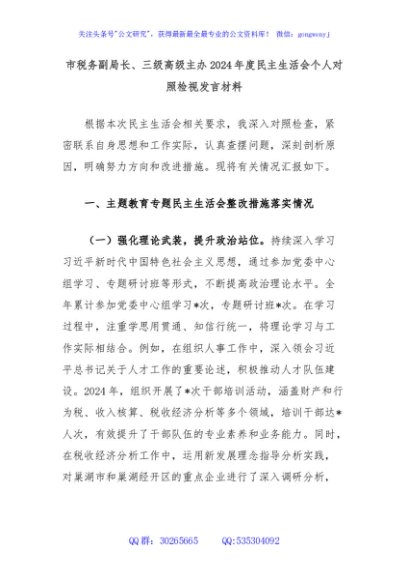 / 市税务副局长、三级高级主办2024年度民主生活会个人对照检视发言材料
