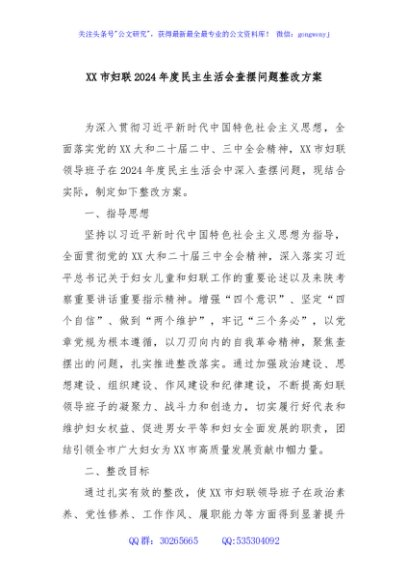 / XX市妇联2024年度民主生活会查摆问题整改方案