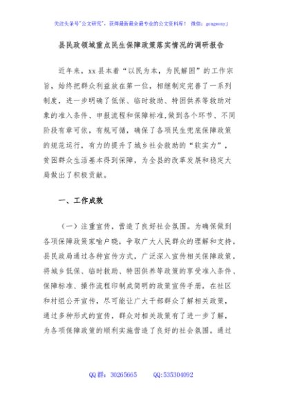 / 县民政领域重点民生保障政策落实情况的调研报告