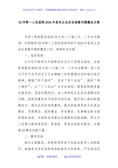 / XX市第一人民医院2024年度民主生活会查摆问题整改方案