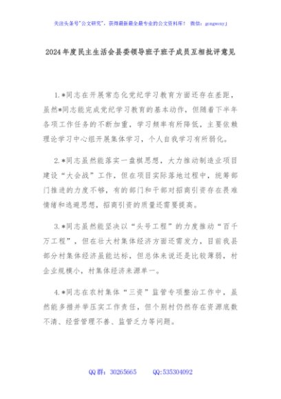 / 2024年度民主生活会县委领导班子班子成员互相批评意见