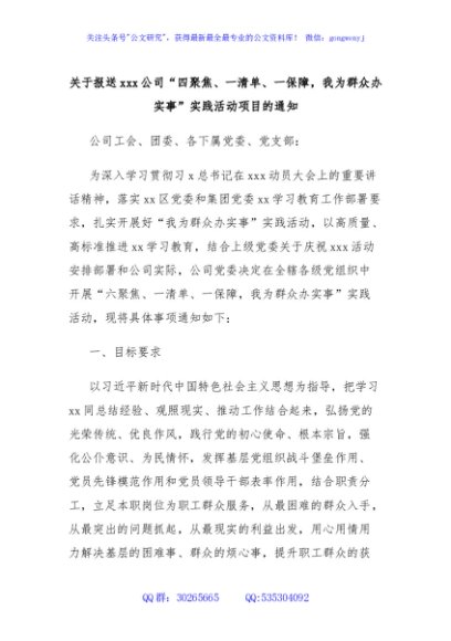 / 关于报送xxx公司“四聚焦、一清单、一保障,我为群众办实事”实践活动项目的通知