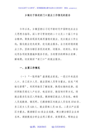 / 乡镇关于推进家门口就业工作情况的报告