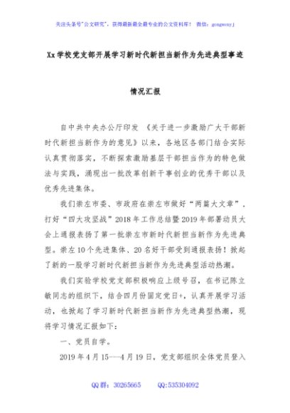 / Xx学校党支部开展学习新时代新担当新作为先进典型事迹情况汇报