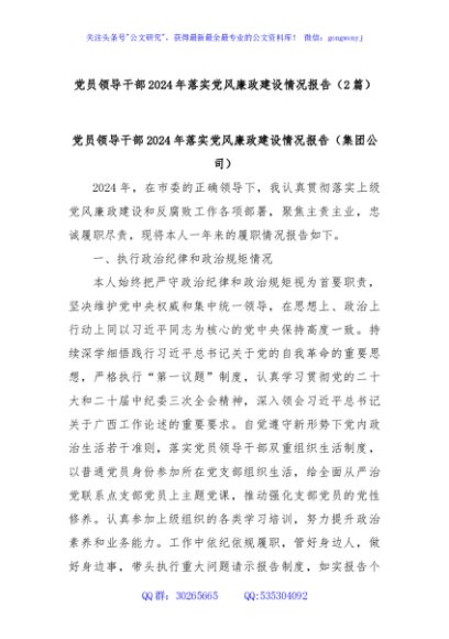 / (2篇)党员领导干部2024年落实党风廉政建设情况报告