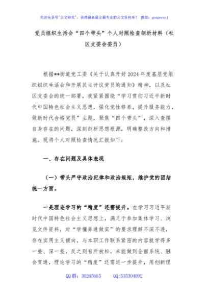 / 党员组织生活会“四个带头”个人对照检查剖析材料(社区支委会委员)