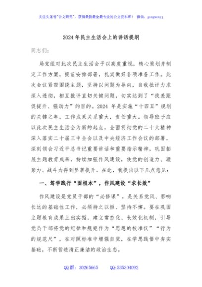 / 2024年民主生活会上的讲话提纲
