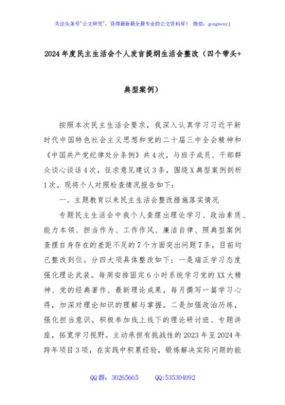 / 2024年度民主生活会个人发言提纲生活会整改(四个带头+典型案例)