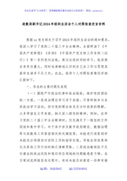 / 政数局副书记2024年组织生活会个人对照检查发言材料