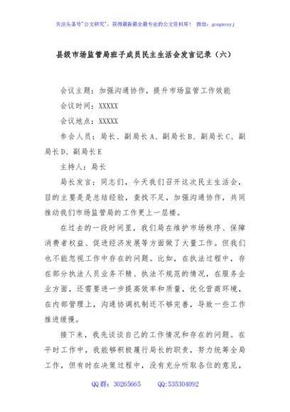 / 县级市场监管局班子成员民主生活会发言记录(六)