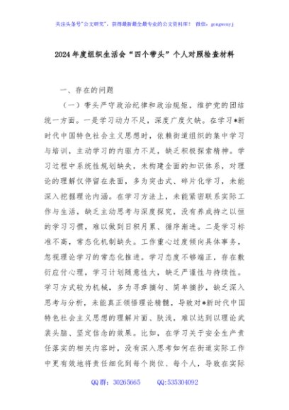 / 2024年度组织生活会“四个带头”个人对照检查材料