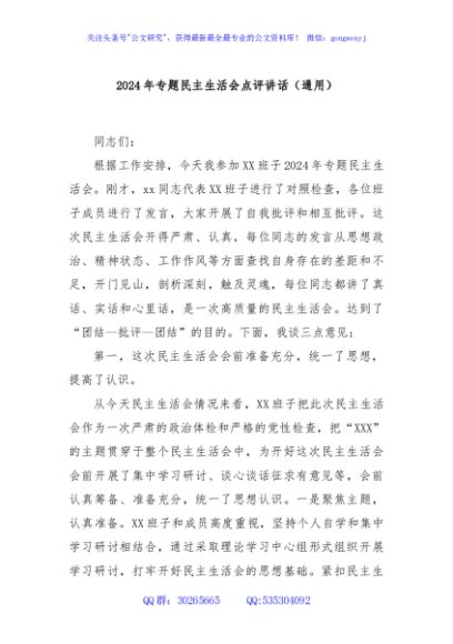 / 2024年专题民主生活会点评讲话(通用)
