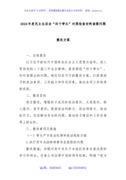 / 2024年度民主生活会“四个带头”对照检查材料查摆问题整改方案