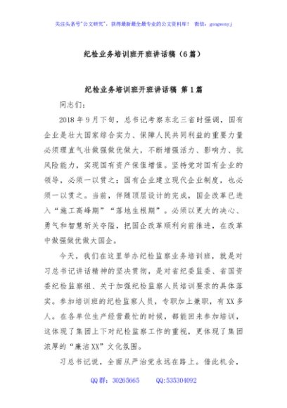 (6篇)纪检业务培训班开班讲话稿