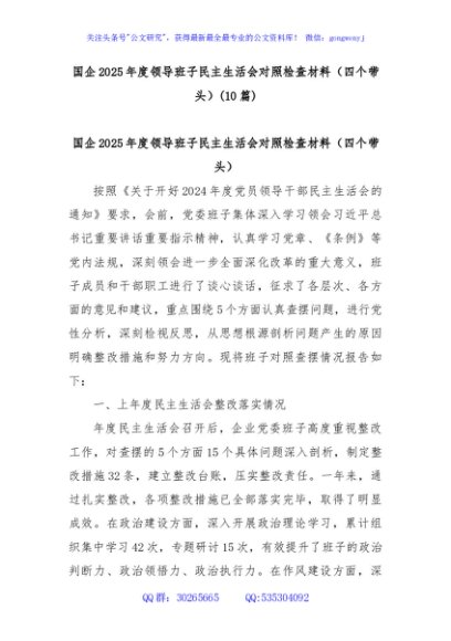 / (10篇)国企2025年度领导班子民主生活会对照检查材料(四个带头)