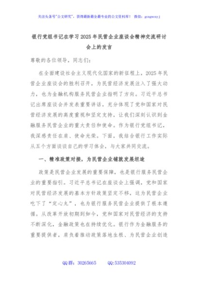/ 银行党组书记在学习2025年民营企业座谈会精神交流研讨会上的发言