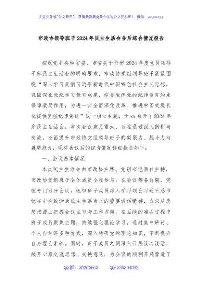 / 市政协领导班子2024年民主生活会会后综合情况报告