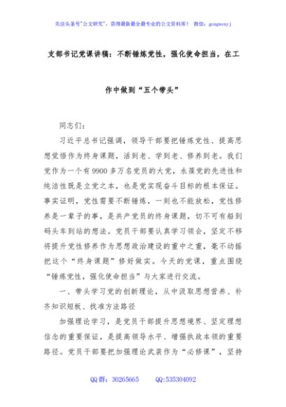 / 支部书记党课讲稿:不断锤炼党性,强化使命担当,在工作中做到“五个带头”