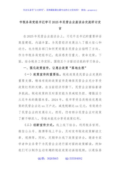 / 市税务局党组书记学习2025年民营企业座谈会交流研讨发言