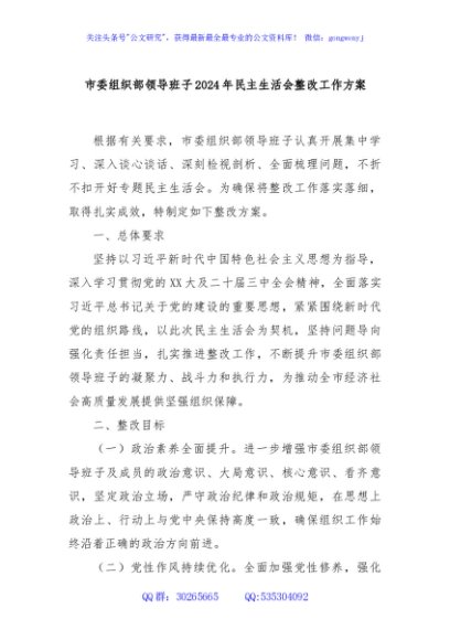 / 市委组织部领导班子2024年民主生活会整改工作方案
