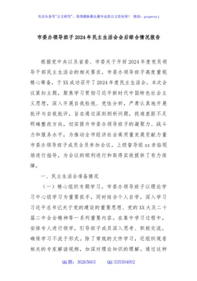 / 市委办领导班子2024年民主生活会会后综合情况报告