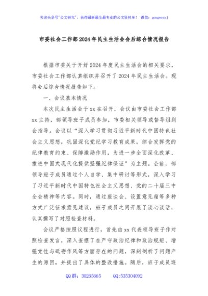/ 市委社会工作部2024年民主生活会会后综合情况报告