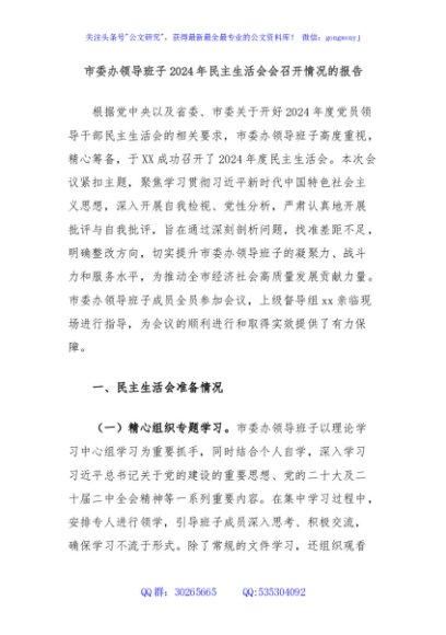 / 市委办领导班子2024年民主生活会会召开情况的报告
