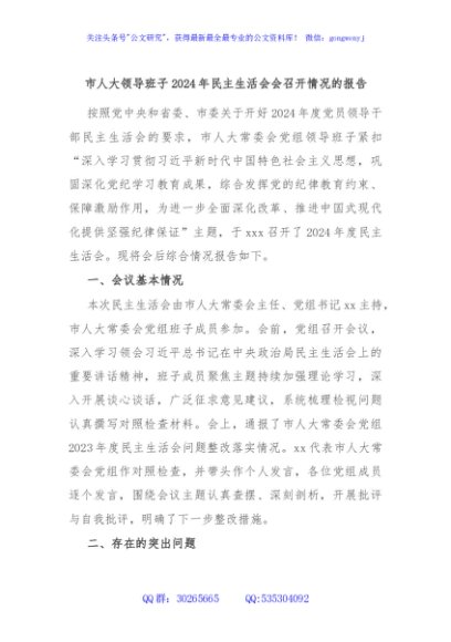 / 市人大领导班子2024年民主生活会会召开情况的报告