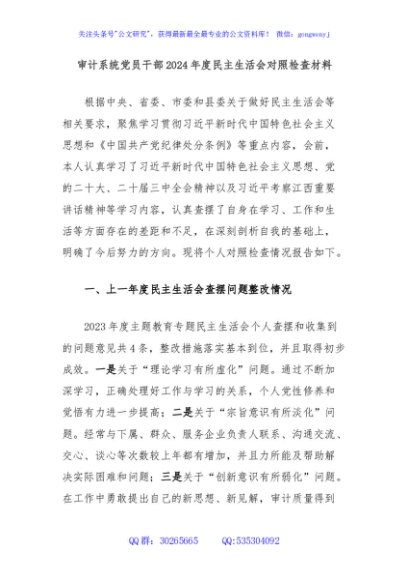 / 审计系统党员干部2024年度民主生活会对照检查材料