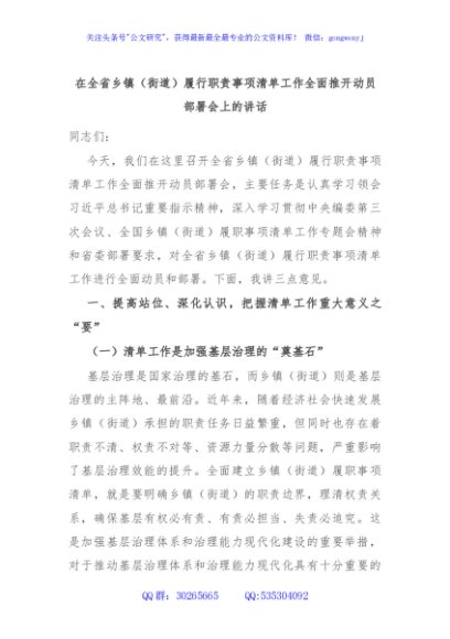 / 在全省乡镇(街道)履行职责事项清单工作全面推开动员部署会上的讲话