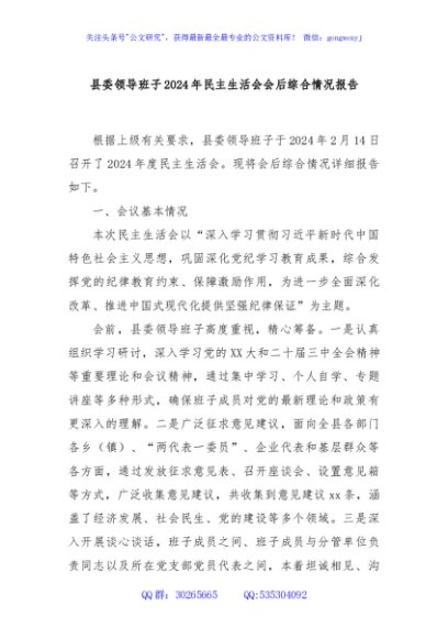 / 县委领导班子2024年民主生活会会后综合情况报告