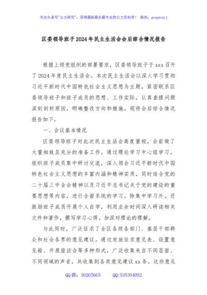 / 区委领导班子2024年民主生活会会后综合情况报告
