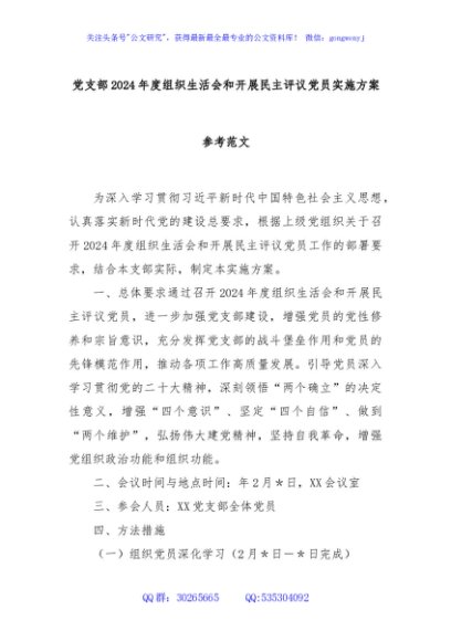 / 党支部 2024 年度组织生活会和开展民主评议党员实施方案参考范文