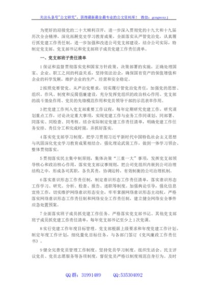 党支部班子及班子成员党建工作责任清单