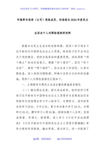 / 市烟草专卖局(公司)党组成员、纪检组长2024年度民主生活会个人对照检视剖析材料