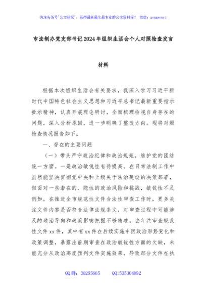 / 市法制办党支部书记2024年组织生活会个人对照检查发言材料