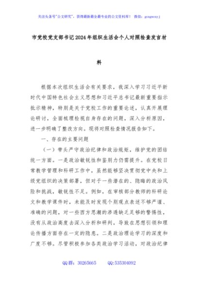 / 市党校党支部书记2024年组织生活会个人对照检查发言材料