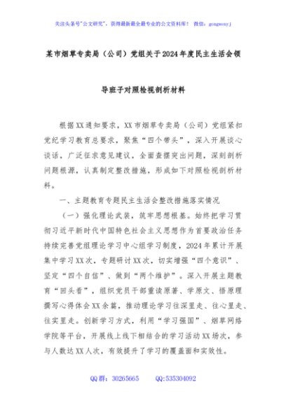 / 某市烟草专卖局(公司)党组关于2024年度民主生活会领导班子对照检视剖析材料