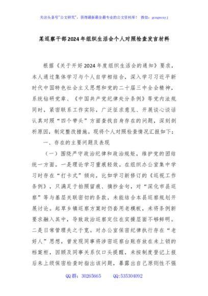 / 某巡察干部2024年组织生活会个人对照检查发言材料