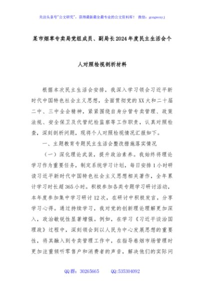 / 某市烟草专卖局党组成员、副局长2024年度民主生活会个人对照检视剖析材料