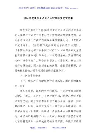 / 2024年度组织生活会个人对照检查发言提纲