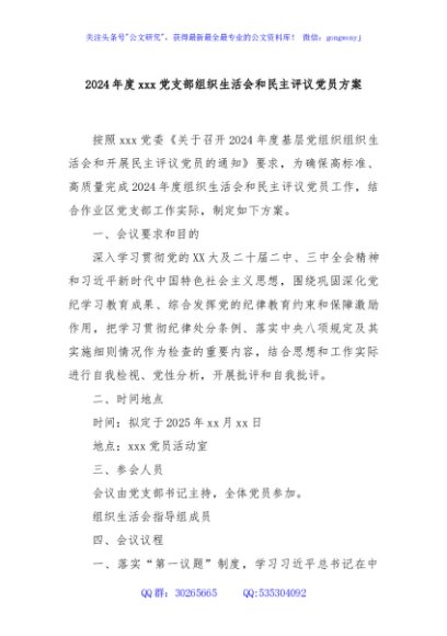 / 2024年度xxx党支部组织生活会和民主评议党员方案