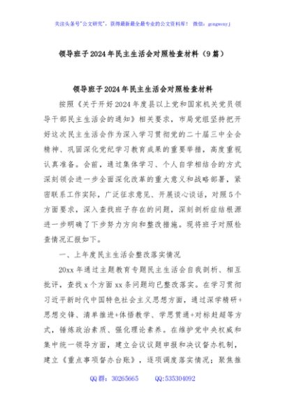 / (9篇)领导班子2024年民主生活会对照检查材料