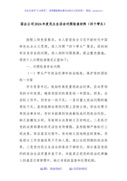 / 国企公司2024年度民主生活会对照检查材料(四个带头)