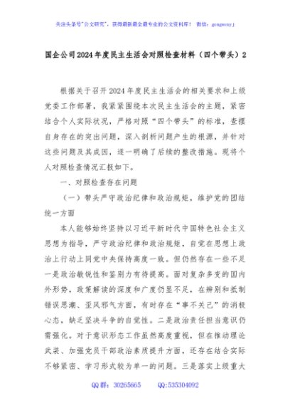 / 国企公司2024年度民主生活会对照检查材料(四个带头)2